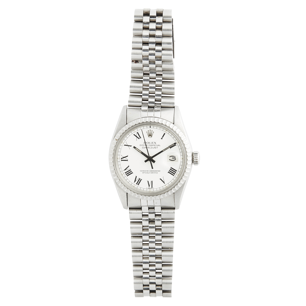 Oyster Perpetual Datejust, plain bezel, white dial, black Roman numerals, sweep second hand, date indicator, jubilee bracelet, fold over clasp, with leather box and outer Oyster cardboard box, booklet