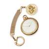 of plain form, crown at twelve, tall arched loop, plain bezel, silvered dial, baton numerals, sweep second hand, snap off back, engraved inscription, cal. 89, movement no. 1629765, back no. 1650183, the chain of pendant form in 18ct gold, key type clip to the braided chain, applied blank lozenge and with a pendant showing a lion to one side and classical woman to the other