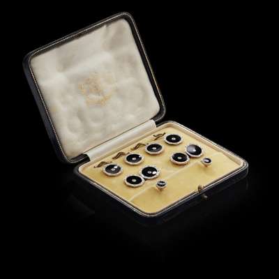apparently unmarked comprising; a pair of cufflinks, set four buttons and frames, pair of studs, each of octagonal frame with a rose cut diamond set border, inset onyx disc with single eight cut diamond to the centre, cased in a Le Roy box