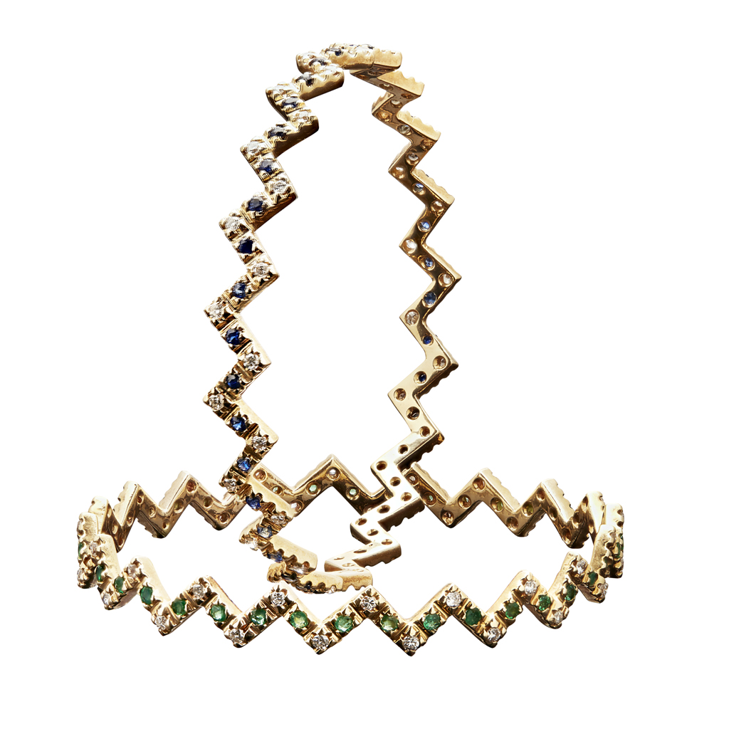 each of zig zag design, set with alternating round cut sapphires or emeralds and diamonds, stamped 18K (2)