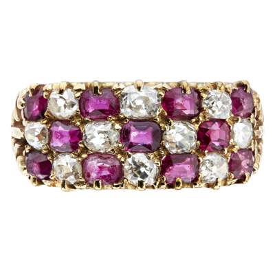 claw set with three rows of alternating oval cut rubies and old round cut diamonds, to a plain yellow metal shank