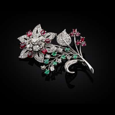 GARRARD & CO - A diamond, ruby and emerald set floral brooch