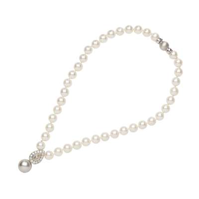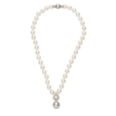 composed of a single strand of cultured pearls suspending pear shaped drop, millegrain set with a central pear shaped diamond, in a border of slightly graduated round brilliant cut diamonds, above a removable grey pearl