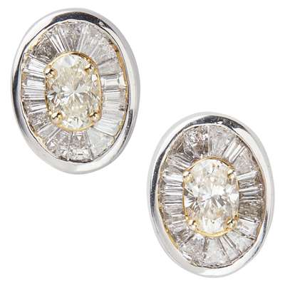 each claw set with a central oval yellow diamond, in a collet set border of tapered baguette cut diamonds, to post and butterfly fittings stamped 18K