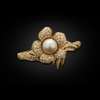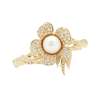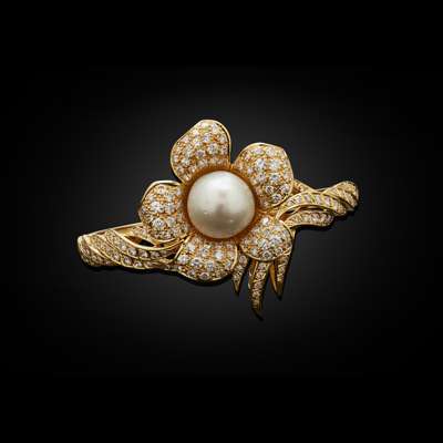of hinged design, the front modelled as a scrolling flower head set with a central cultured pearl, the surround pavé set throughout with graduated round brilliant cut diamonds, set in unmarked yellow metal