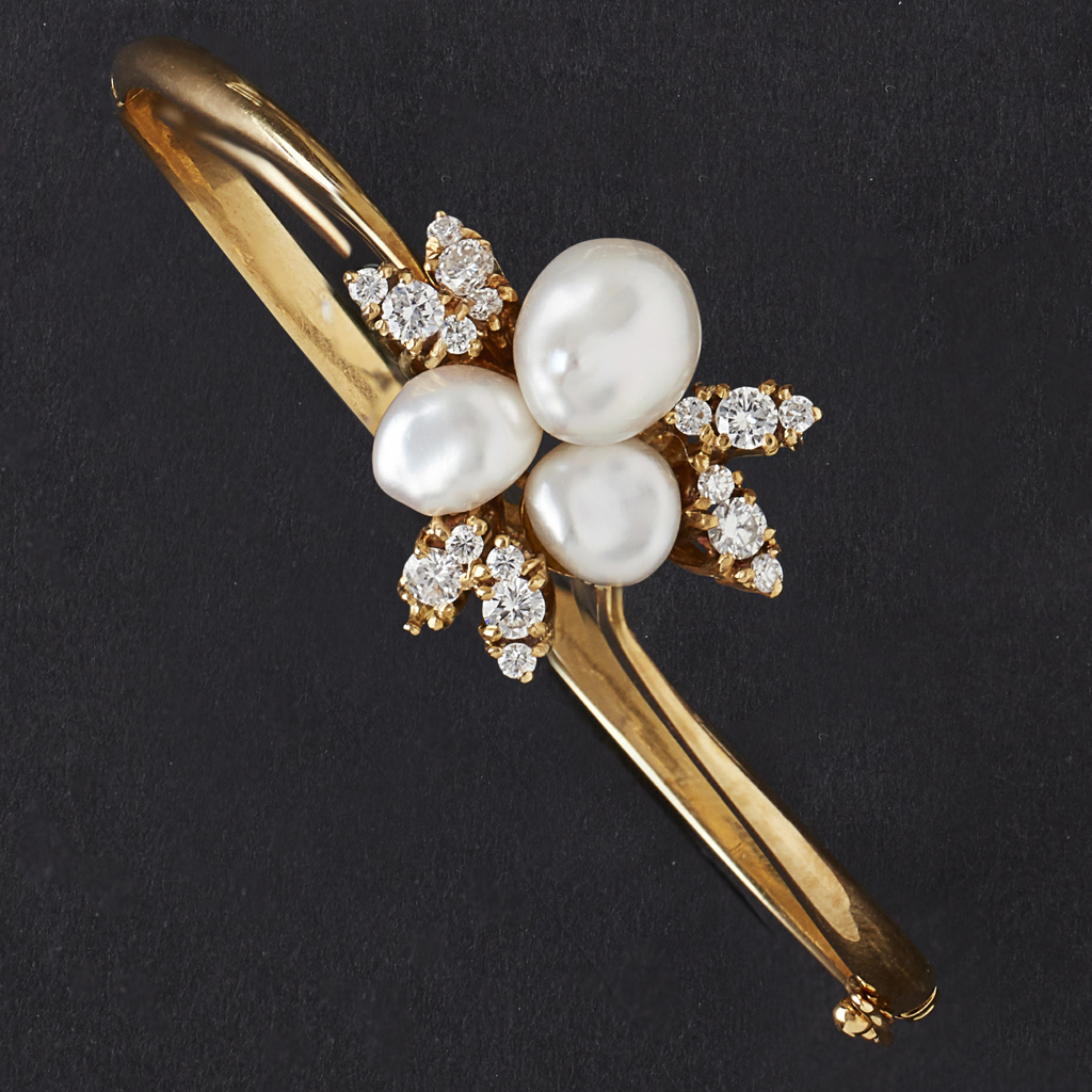 of hinged design, set with three off-oval pearls, graduated round cut diamond detail, to a plain bangle, unmarked