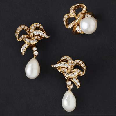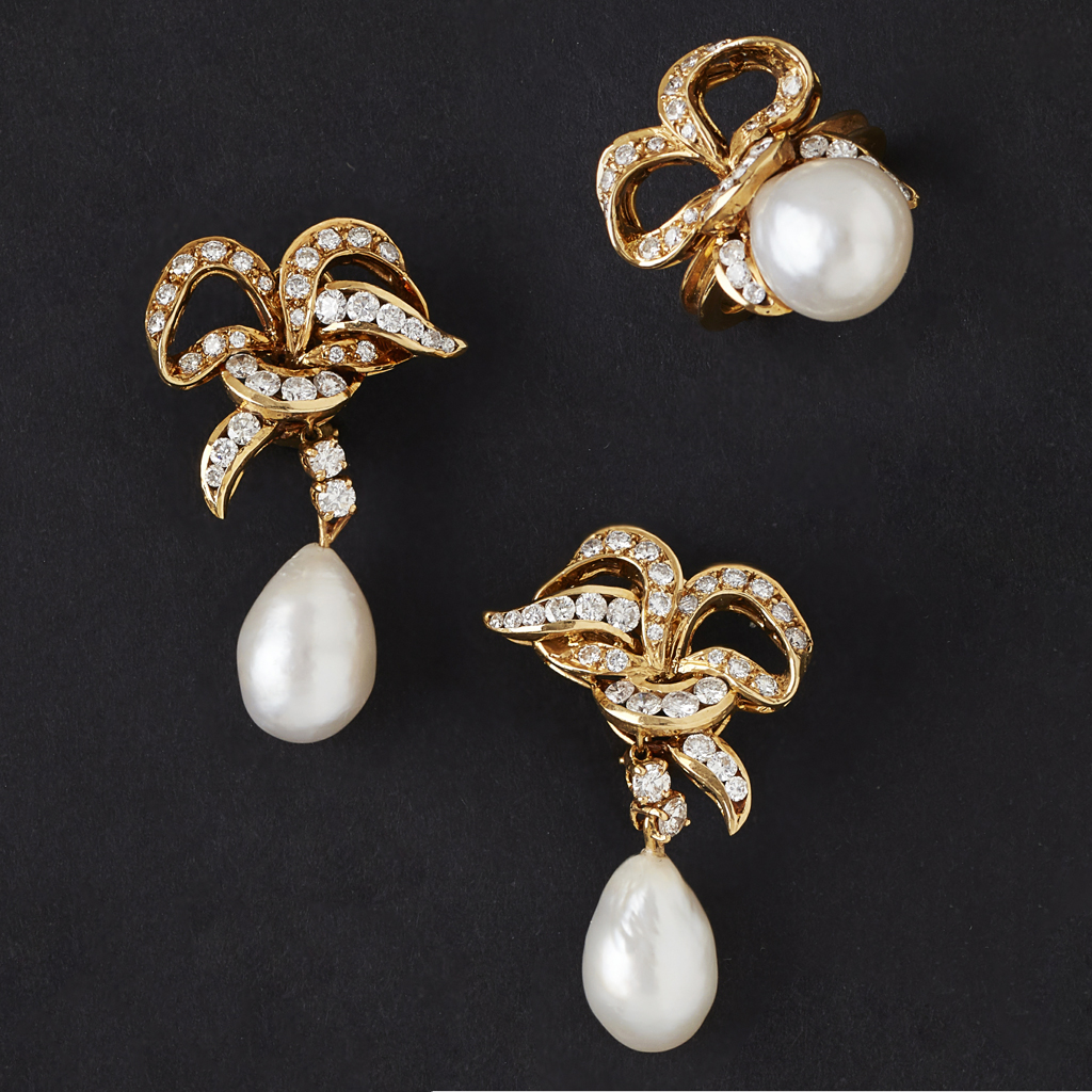 each earring modelled as a tied bow set throughout with graduated round brilliant cut diamonds, suspending a drop shaped cultured pearl; the ring of matching design (2)