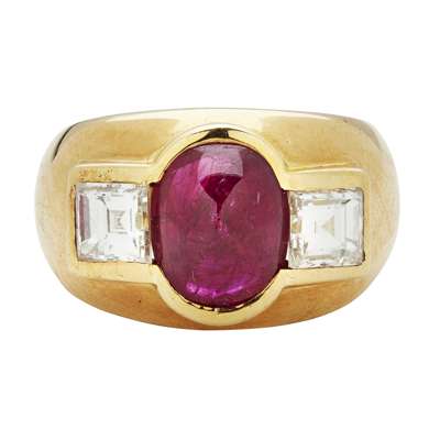 collet set with a ruby cabochon flanked to either side by a square cut diamond, to a tapering mount, inside shank stamped 750, French control marks to outside shank