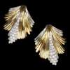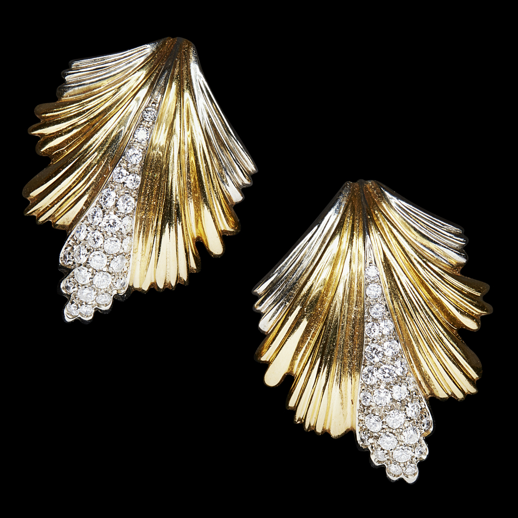 of palmette shape, the central fond pavé set with small eight cut diamonds, to post and spring fittings, marked 750