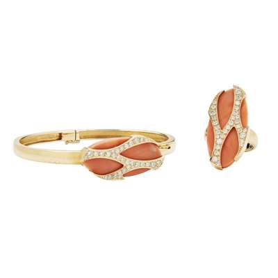A coral and diamond set bangle and matching ring Y