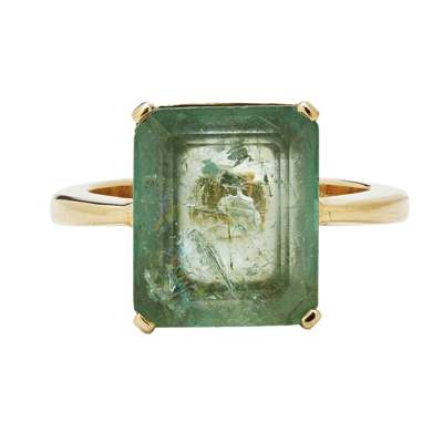 claw set with a rectangular mixed cut emerald, to a plain yellow metal shank stamped 18k