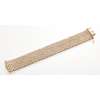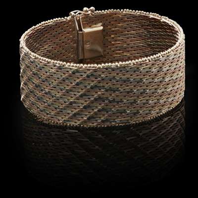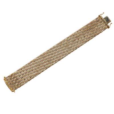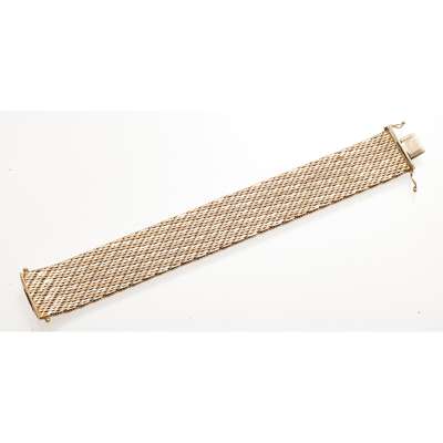 the broad band composed of yellow, white and rose woven links with beaded detail to edge, the concealed clasp with safety clips, stamped 9K