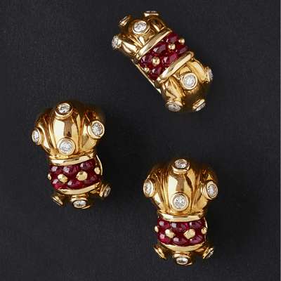 set with six ruby cabochons, the shoulders each collet set with four round brilliant cut diamonds; together with a pair of matching clip earrings, each of lobed design, collet set throughout with round brilliant cut diamonds, and six cabochon cut rubies (2)