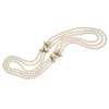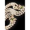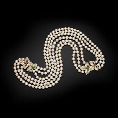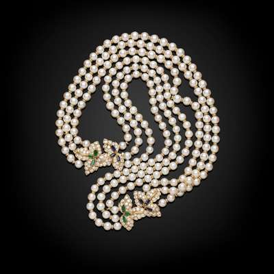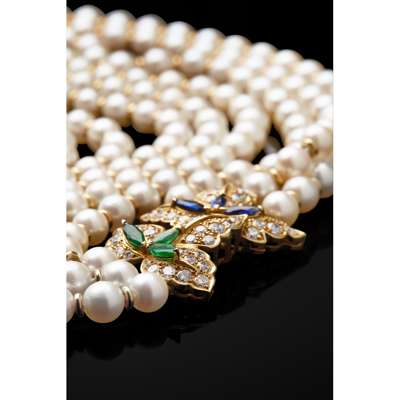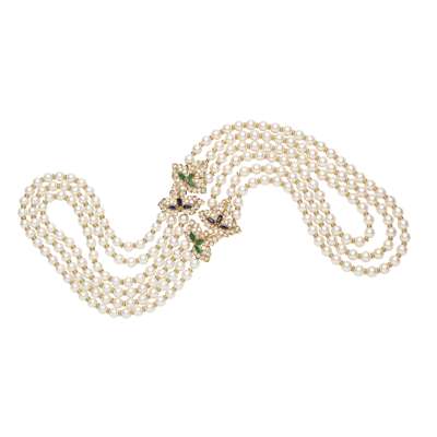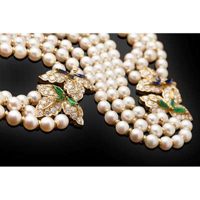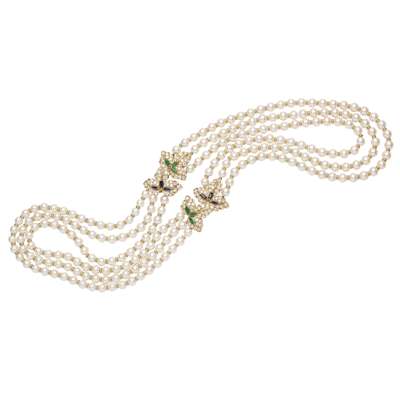 composed of three graduated stands of uniform cultured pearls and small hooped spacers, the clasp and matching spacer modelled as two leaves, set throughout with graduated round brilliant cut diamonds and marquise cut sapphire and emerald detail, stamped 750