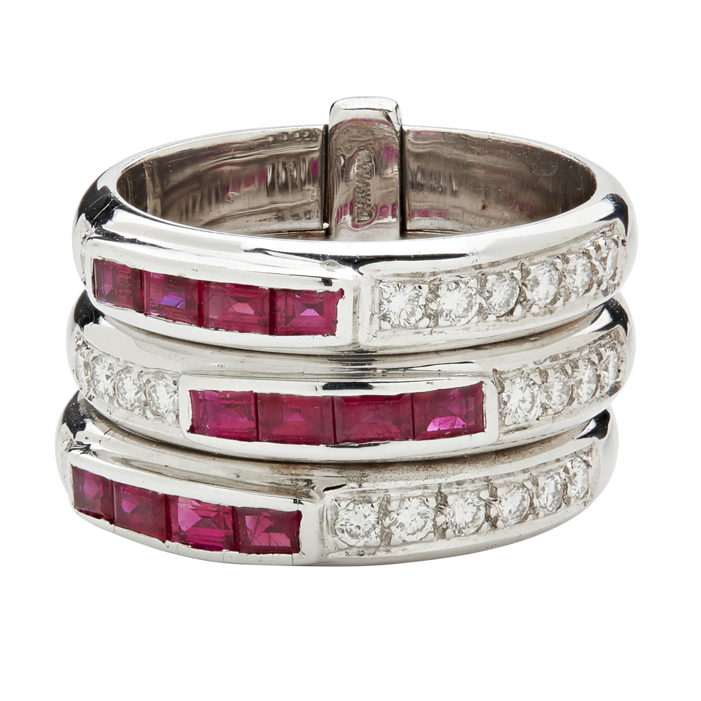 each band channel set with four rectangular cut rubies, set to either side by round brilliant cut diamonds, with band joining the three, signed Mouawad, indistinctly marked