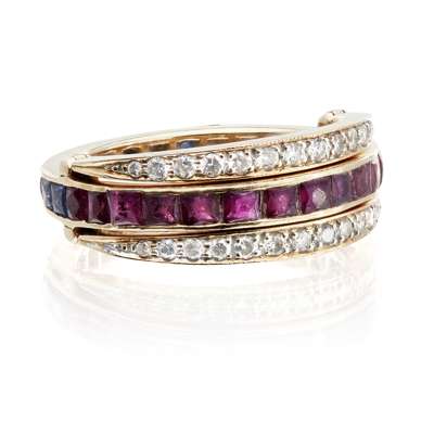 A ruby, diamond and sapphire ring