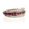 channel set with a row of square cut rubies and sapphires, flanked above and below by a hinged half circle each set with small round cut diamonds, set in unmarked white metal
