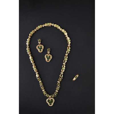 comprising a necklace, pendant earrings and ring; the necklace composed of bow shaped links with green enamel and diamond set detail, five links are also set with cabochon peridots, suspending a cabochon peridot pendant in a border of small round cut diamonds; the earrings of a similar design, to post and butterfly fittings; the ring collet set with an oval peridot with small cut diamond detail, all stamped 750, signed MOUAWAD (3)