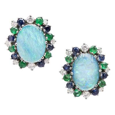 each set to the centre with an opal triplet in a border of small round cut emeralds, rubies and diamonds, to clip fittings stamped 18ct