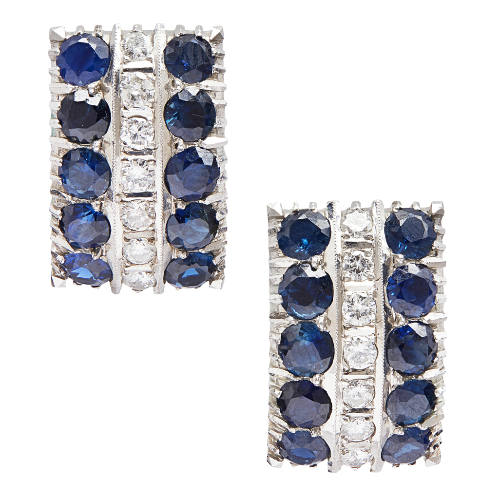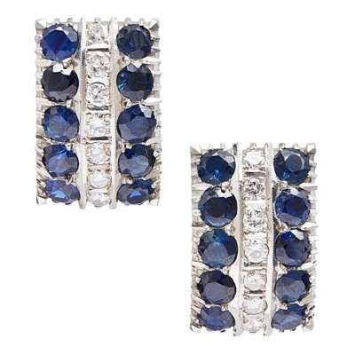 each of curved rectangular outline, set with a central row of round brilliant cut diamonds between two rows of larger round cut sapphires, to post and butterfly fittings, unmarked