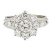 claw set with a round brilliant cut diamond, in a single border of smaller round brilliant cut diamonds, each shoulder set with a baguette cut diamond, to a plain white metal shank with split shoulders
