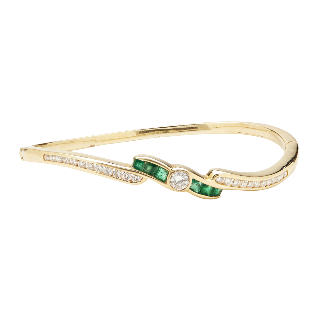 of hinged design, collet set with a round brilliant cut diamond, flanked to either side by curved shoulders, each set with three channel set emeralds and twelve small round brilliant cut diamonds