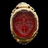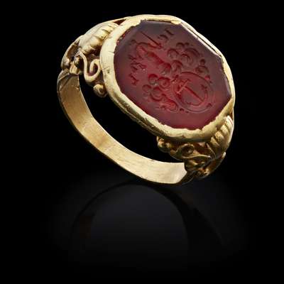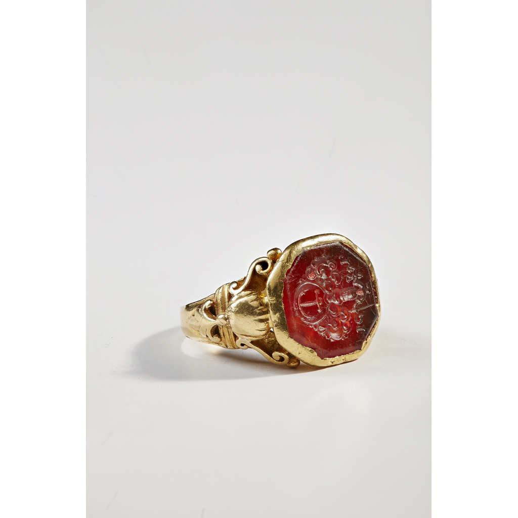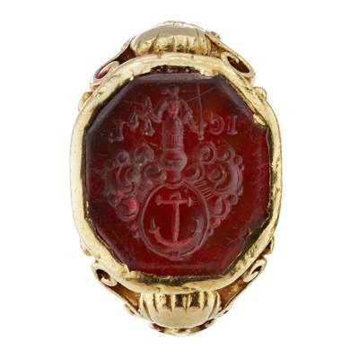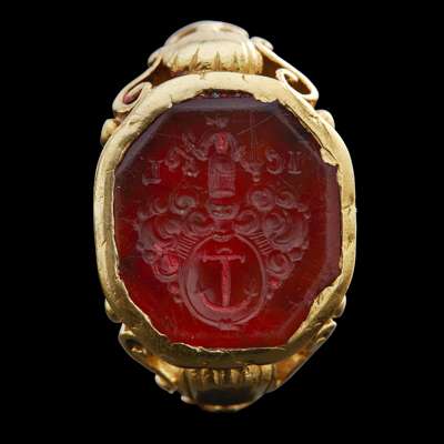 unmarked, the carved chaledony intaglio with armorial, chased border, shell clasped shoulders with scrolling supports and detail