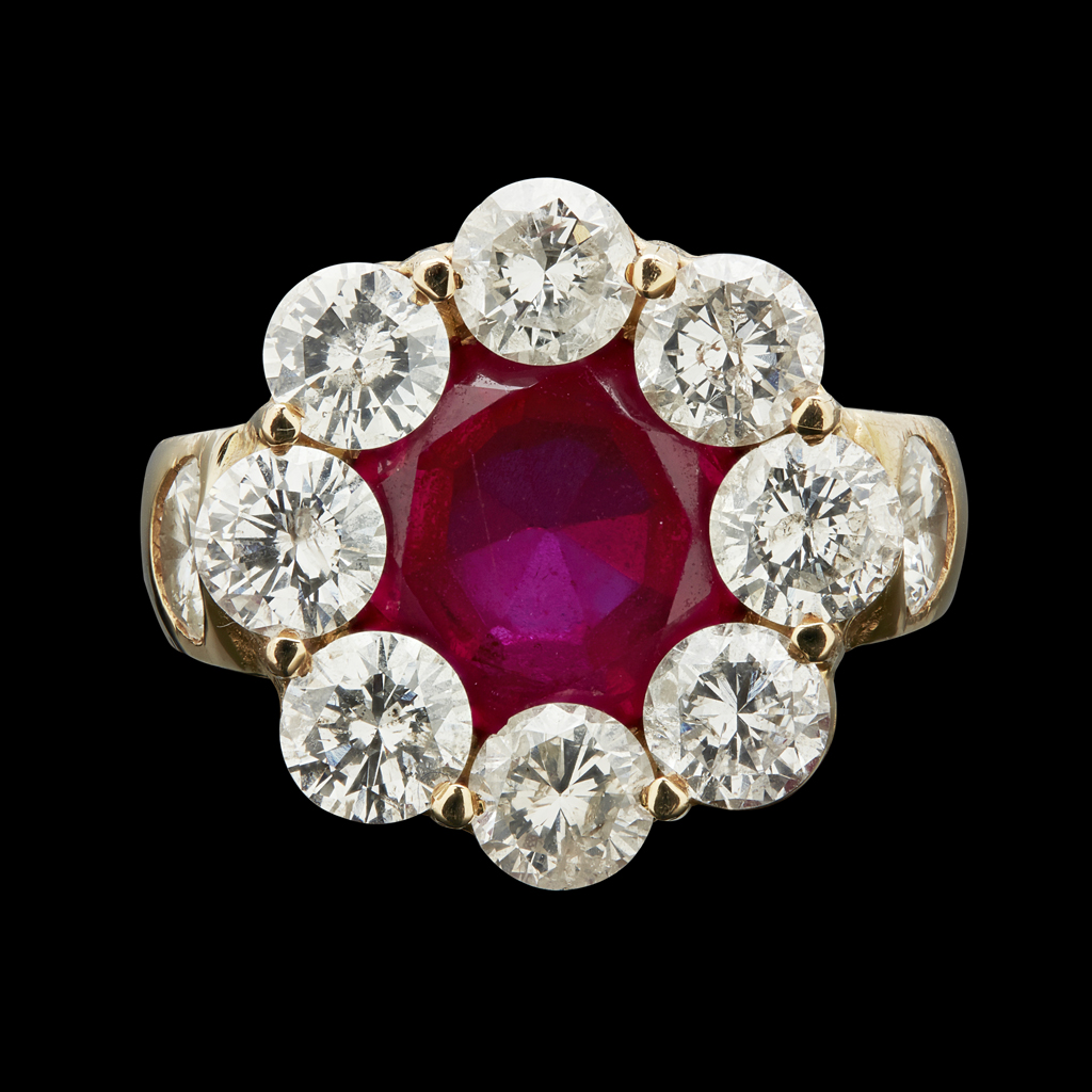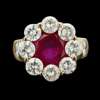 A synthetic ruby and diamond set cluster ring