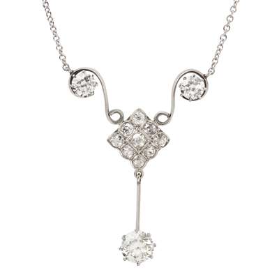 the two round cut diamonds on curved links raising a square panel, set with old round and cushion cut diamonds, the whole suspending a knife bar drop terminating in a round cut diamond, to an integral platinum belcher link chain