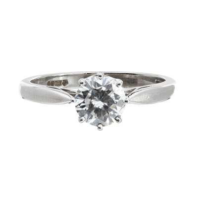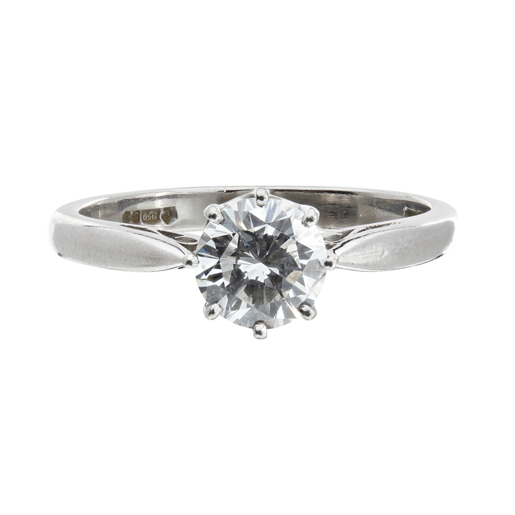 claw set with a round brilliant cut diamond, to a plain platinum shank