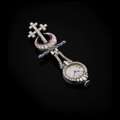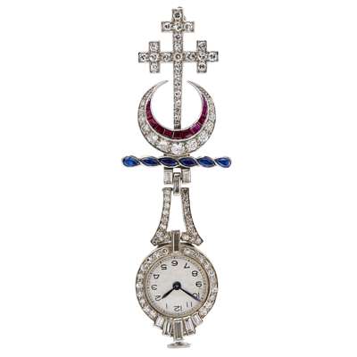 modelled as the arms for the Hannay family, set throughout with graduated round and eight cut diamonds, channel set square cut rubies and marquise cut sapphires, suspending an eight cut diamond set link, the watch head in a surround of eight and baguette cut diamonds, the plain dial with Arabic numerals