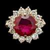 claw set with a round brilliant cut synthetic ruby, in a border of round brilliant cut diamonds, to a plain yellow metal shank, stamped 18k