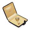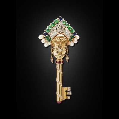 modelled as a crowned mask surmounting a key, set throughout with round brilliant and baguette cut diamonds, emerald cabochons, oval cut sapphires and small round cut rubies, with pearl detail to head dress and a cabochon ruby terminal, stamped 750