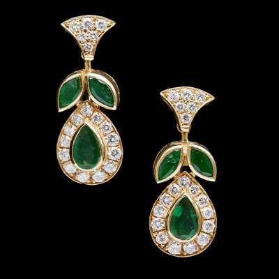 each collet set with a pear cut emerald in a single border of round brilliant cut diamonds, below two collet set marquise cut emeralds, suspended from a pavé set diamond panel, to post and clip fittings, stamped 750
