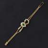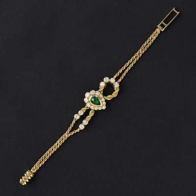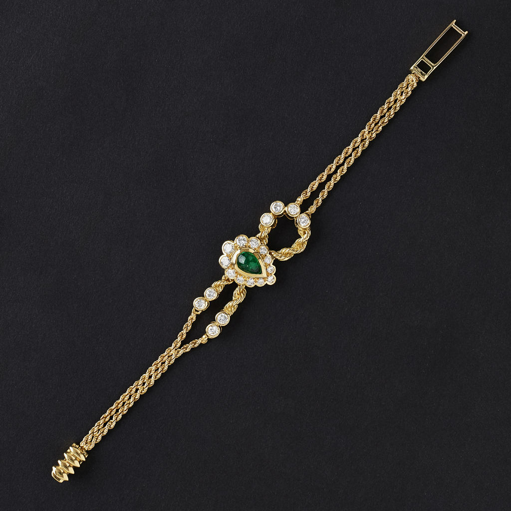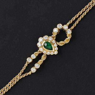 collet set with a pear shaped emerald cabochon in a border of graduated round cut diamonds, clasping a rope twist knot collet set at intervals with small round cut diamonds, to an integral double rope twist bracelet with fold over clasp, stamped 750