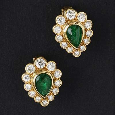 each collet set with a pear shaped emerald cabochon, in a single border of graduated round cut diamonds, to post and clip fittings, stamped 750