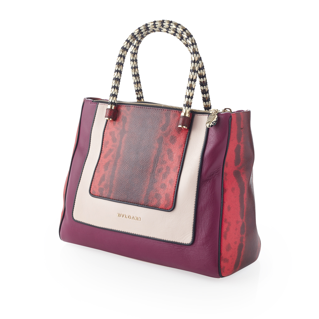modelled in deep and light pink leather and pink snake skin, with polished yellow metal fittings, snake head detail to zip and textured snake skin detail to handles, detachable long pink leather shoulder strap; with dust jacket and waterproof cover