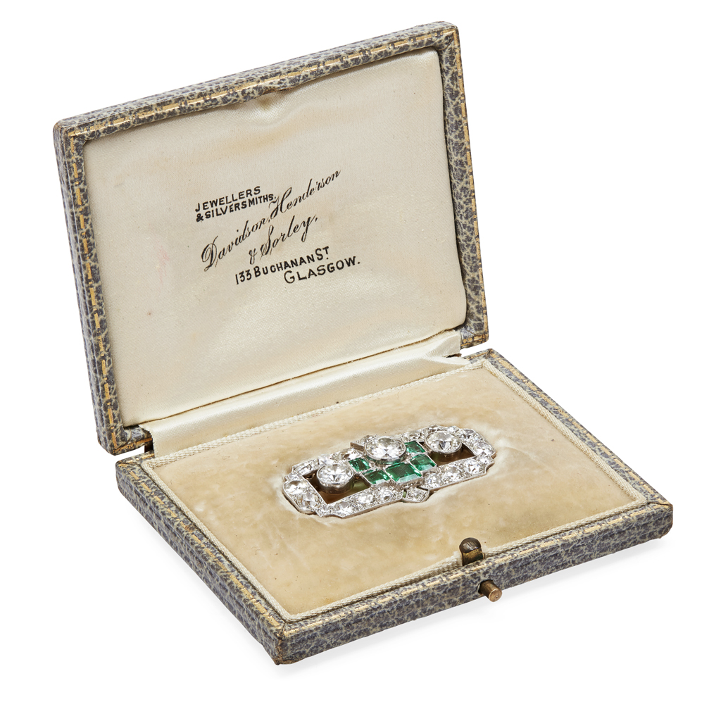 of rectangular geometric design with pierced detail, millegrain set with three graduated round cut diamonds, five graduated rectangular cut emeralds, the border set with old round and cushion cut diamonds, in a fitted box, signed Davidson, Henderson & Sorleys...Glasgow