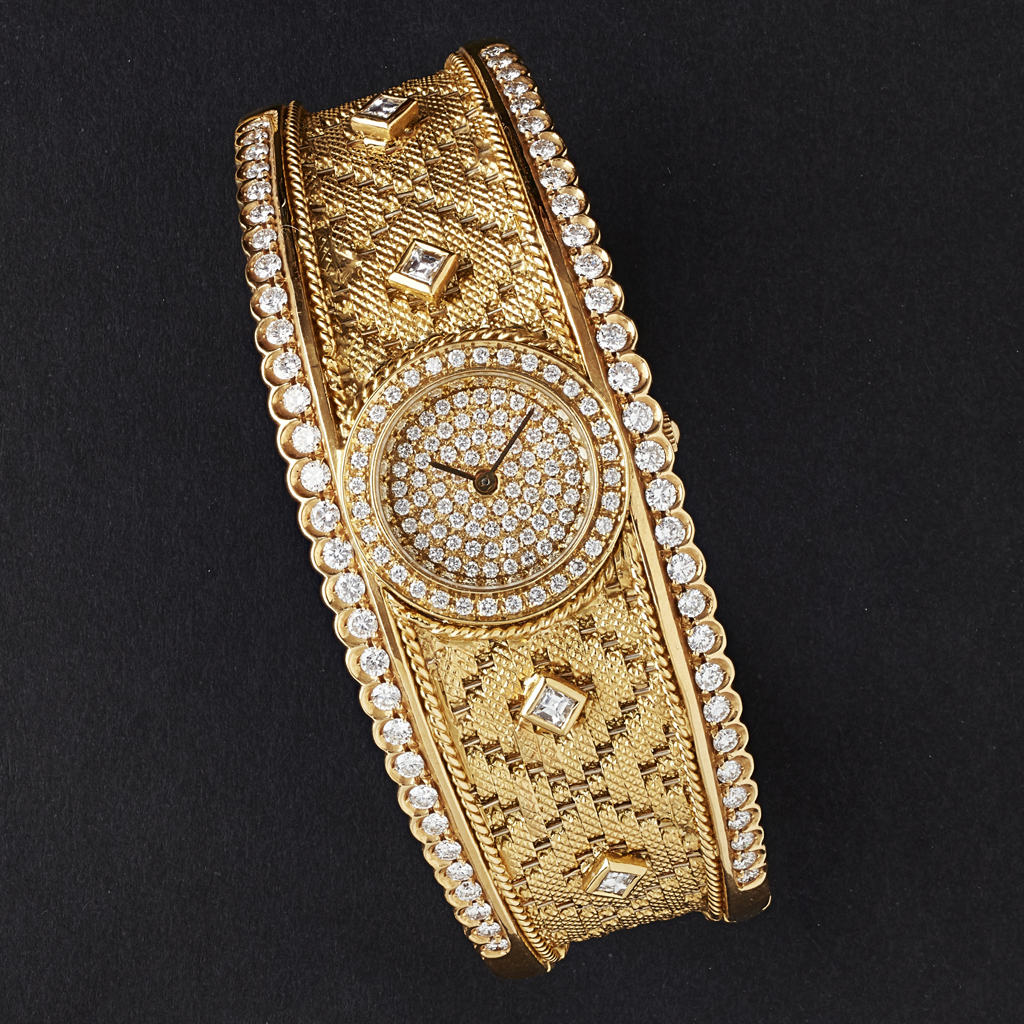 the tapering bangle with diamond set border, textured ground to the central band set with four princess cut diamonds, the watch with a diamond set bezel and pavé set dial, unsigned, screw off back, with two sprung opening sections