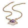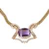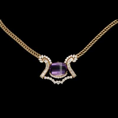 claw set with an oval mixed cut amethyst in a scrolling surround set with round brilliant, marquise, baguette and heart shaped diamonds, to a plain curb link chain with box clasp and safety clip, signed Fitoisi Factory 750