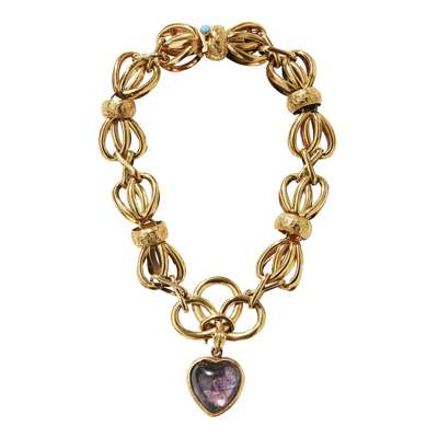 modelled in unmarked yellow metal, the links modelled as stylised bows, suspending a heart shaped pendant, to a concealed clasp and safety chain