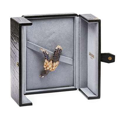 modelled as a stylised bird, pavé set in yellow metal with round cut diamonds and claw set with round cut sapphires, single navette cut diamond to the base, unmarked in a JAHAN box