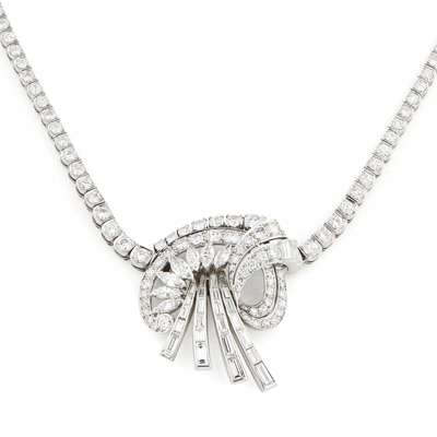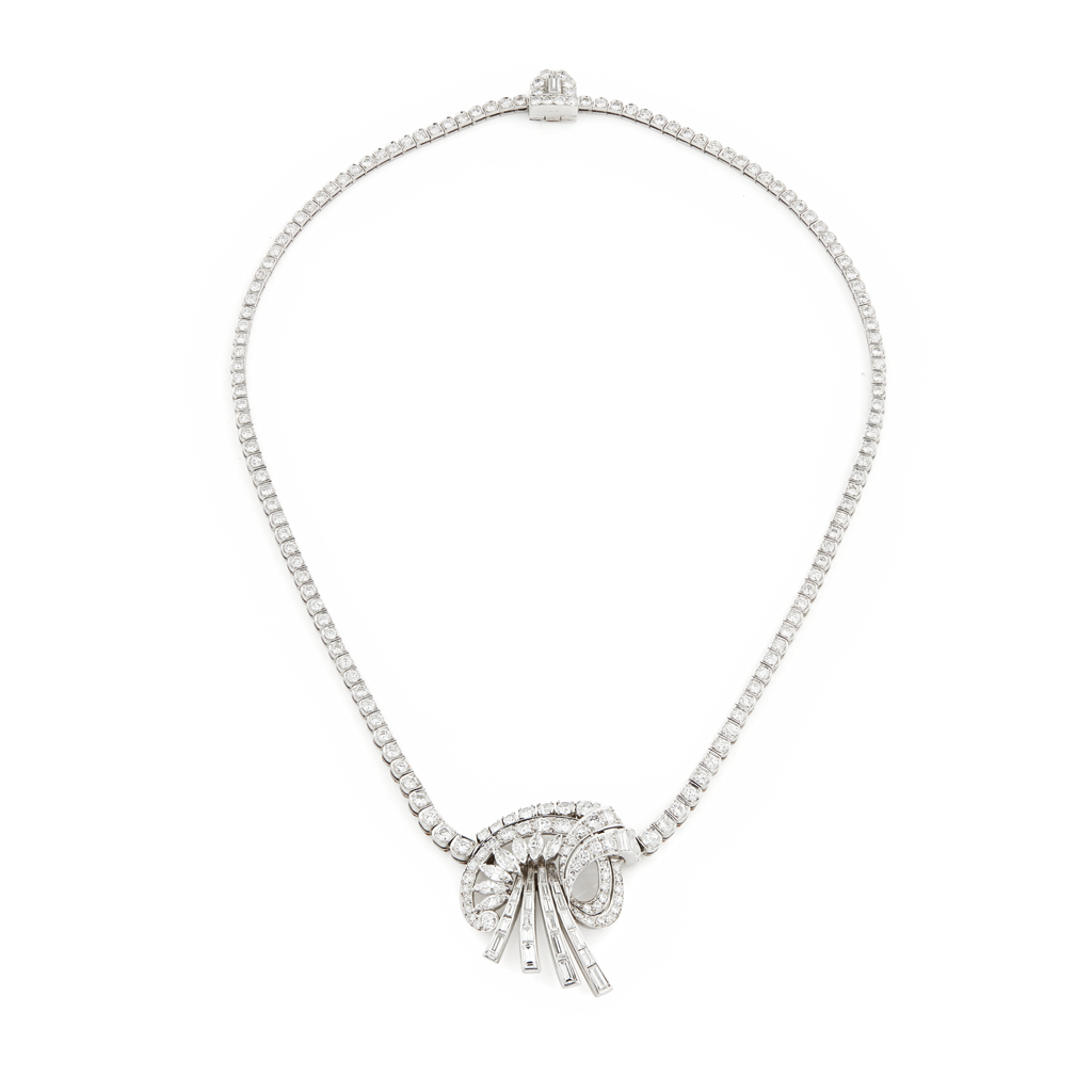 the central scrolling motif set throughout with graduated baguette, round and marquise cut diamonds, the integral necklace composed of curved box links each set with graduated round cut diamonds, to a diamond set clasp