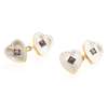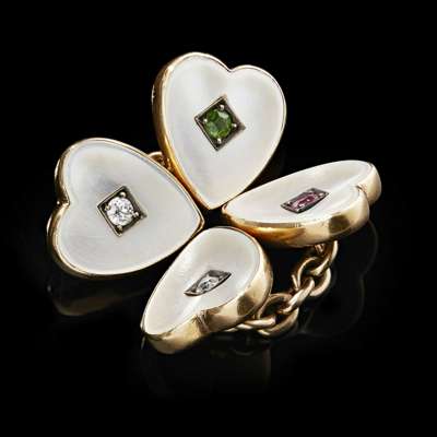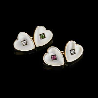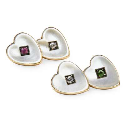 each terminal of heart shape, the mother of pearl ground set with a small round cut diamond or garnet, with conjoining belcher links