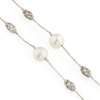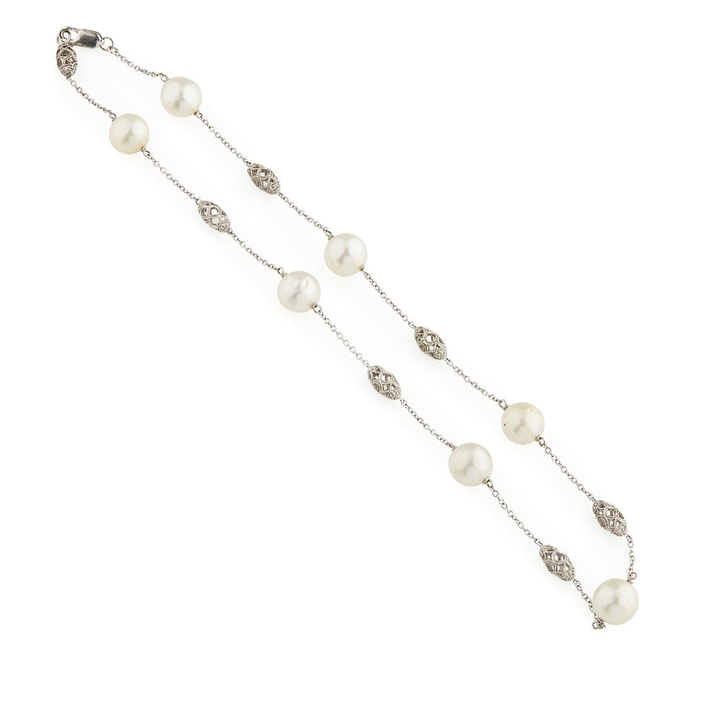composed of a single row of alternating South Sea pearls and pierced lozenge spacers set with small eight cut diamonds, to belcher links, clasp stamped 585