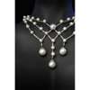 composed of three intersecting rows of millegrain diamond set links, set at intervals with South Sea pearls, suspending three graduated drops of similar design, each terminating a large South Sea pearl with diamond set mount