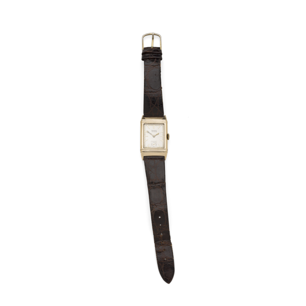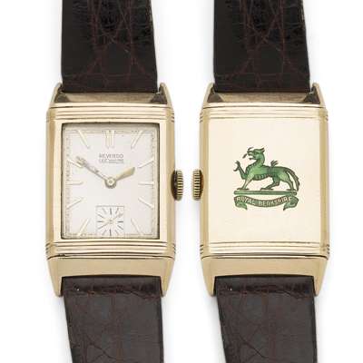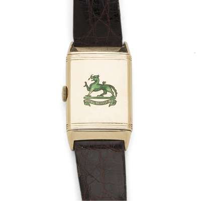 Reverso model, No. 3305, London 1933, of traditional form, slight ribbed case, off white dial with baton indicators, subsidiary seconds hand, sliding and folding over to the back with enamel crest of the Royal Berkshire Regiment, plain leather strap