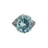claw set with a blue zircon, each shoulder set with two old round and a rose cut diamond, to a plain unmarked white metal shank