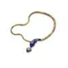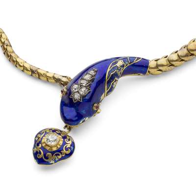 the clasp modelled as a snakes head in blue guilloche enamel with cabochon garnet eyes and old round cut diamond detail to head, suspending a heart shaped pendant with scrolling blue enamel detail and central old round cut diamond, unmarked
