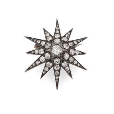 set throughout with graduated old round and rose cut diamonds, the bale set with three rose cut diamonds